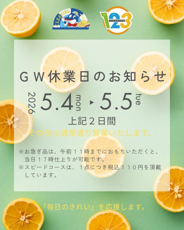 クリーニングイルカ&123 全店でのGW休業日は、